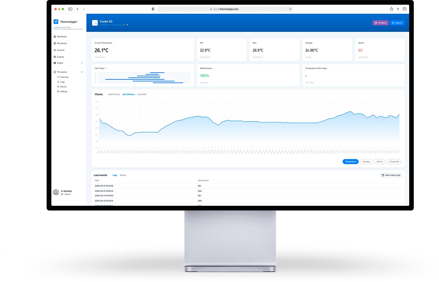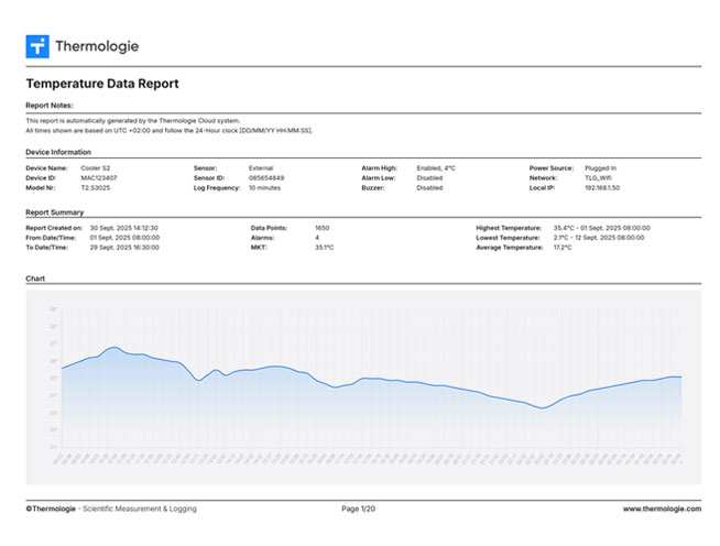 Every T2 device connects automatically to the Thermologie Cloud. Data is securely logged, timestamped, and synced in real time — available anywhere, on any device. Alerts are delivered the moment something requires attention.